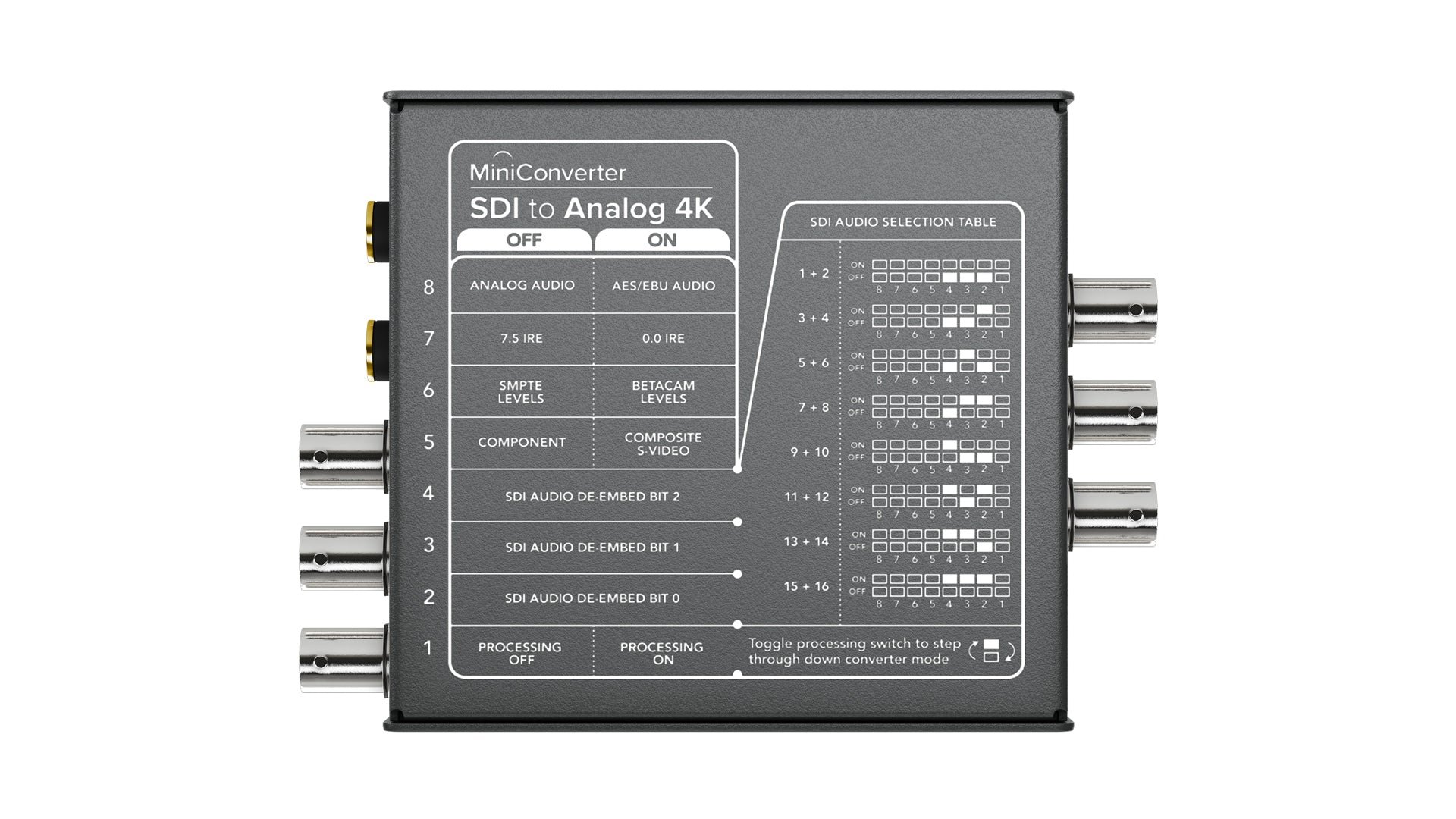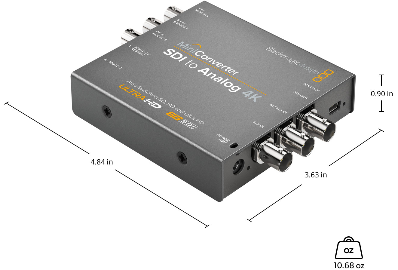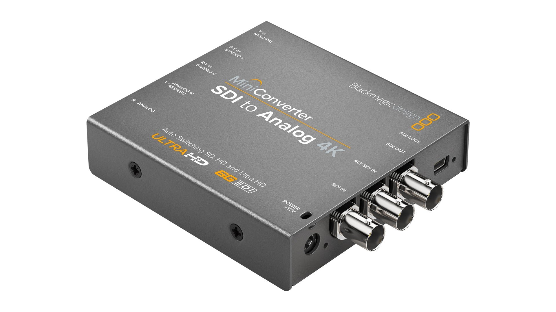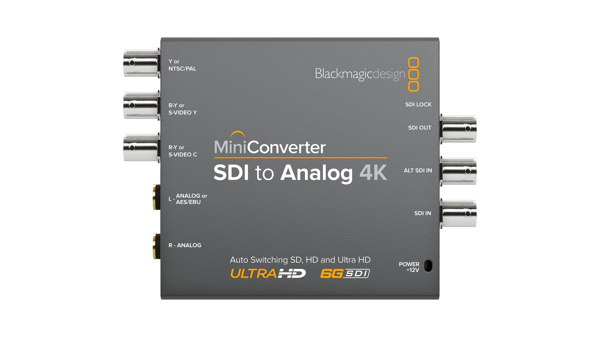 Mini Converter SDI to Analog 4K includes everything you need to convert from SD, HD, 3G and 6G‑SDI video to analog in HD/SD component, NTSC and PAL video. The built in down converter means you can even connect Ultra HD sources to component video in SD or HD as well as NTSC and PAL video! Easily connect any analog equipment such as Betacam SP, VHS, and video monitors