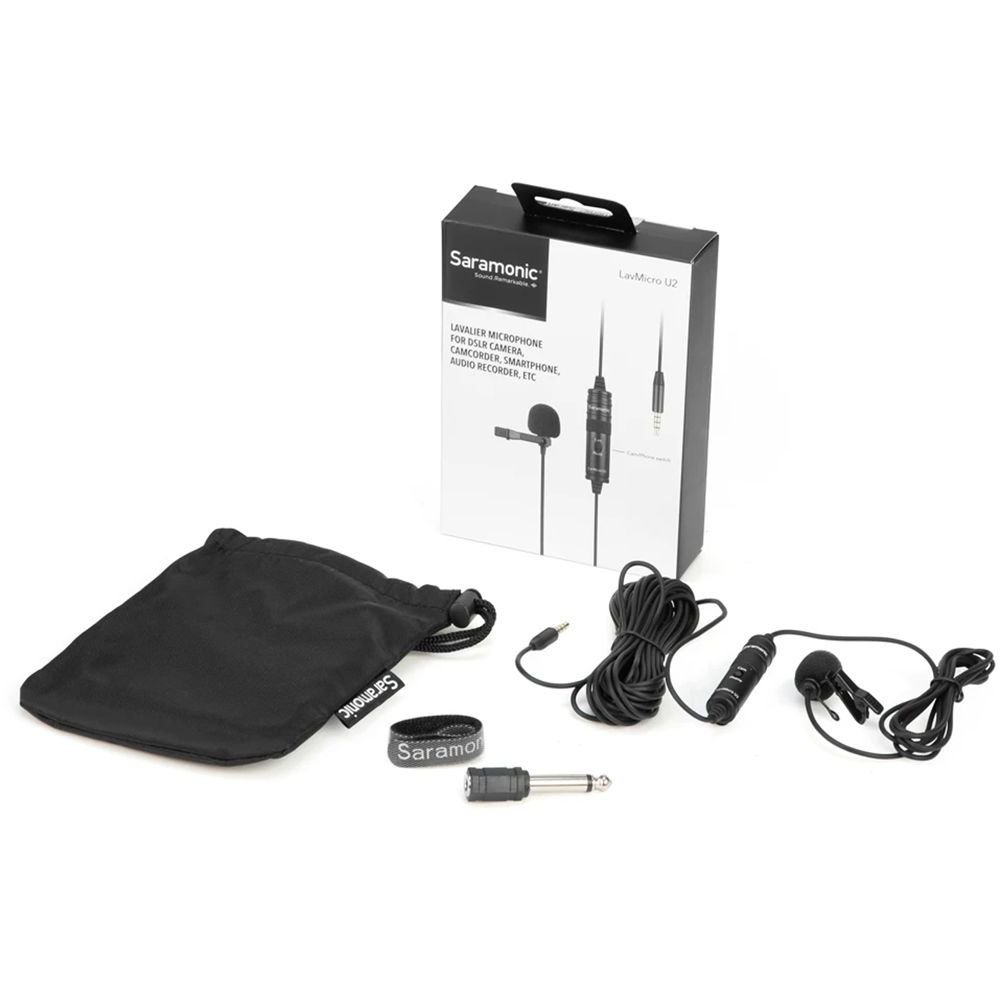 Capture great sound with ease Everything you need to capture perfect sound comes included. A battery comes installed so you can use the LavMicro U2 with cameras and devices that do not provide power to the microphone. The omnidirectional pickup pattern captures sound equally in all directions, so you don’t need to worry about the direction the mic is pointing when you clip it to a shirt. The included alligator-style mic clip holds the LavMicro U2 firmly, and the foam windscreen diffuses unwanted wind noise. A storage pouch with a locking drawstring holds everything neatly.