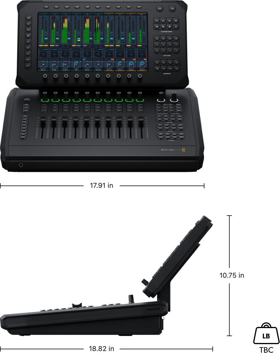 Fairlight Live Audio Panel 10 is a desktop control surface with 10 motorized faders and a large touchscreen display, designed for professional live audio mixing with Fairlight Live. Controls include layers, bus, matrix, aux, VCA, sub-masters and talkback for fast hands-on access to your mix. The touchscreen displays channel strip information, levels, EQ, dynamics processing and plug-in interfaces. Ideal for home studios and small suites. Fully integrated with Fairlight Live.