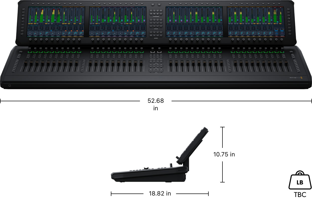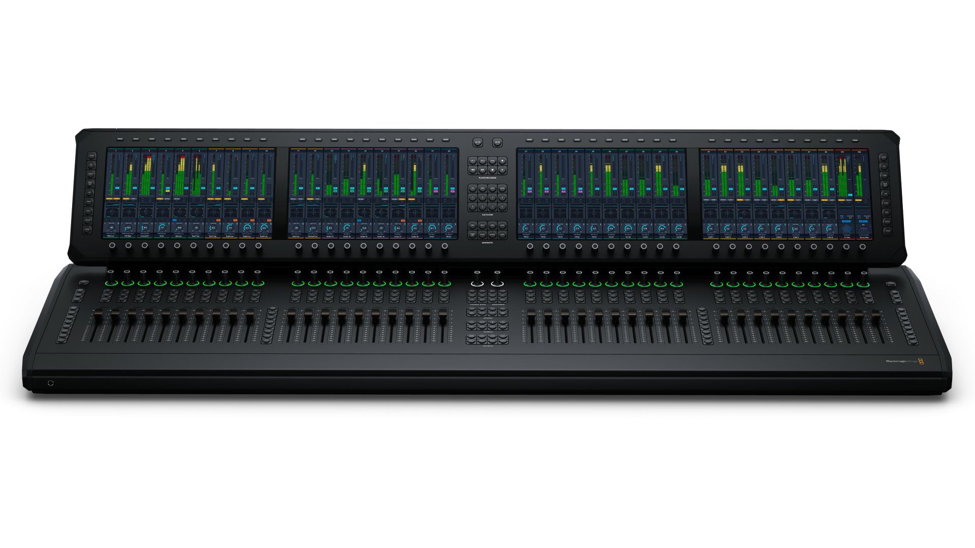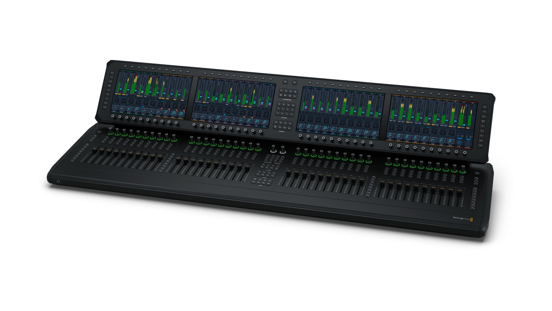 Fairlight Live Audio Panel 40 is a desktop control surface with 40 motorized faders and four large touchscreen displays, designed for professional live audio mixing with Fairlight Live. Controls include layers, bus, matrix, aux, VCA, sub-masters and talkback for fast hands-on access to your mix. The touchscreens display channel strip information, levels, EQ, dynamics processing and plug-in interfaces. Ideal for large live broadcasts. Fully integrated with Fairlight Live.