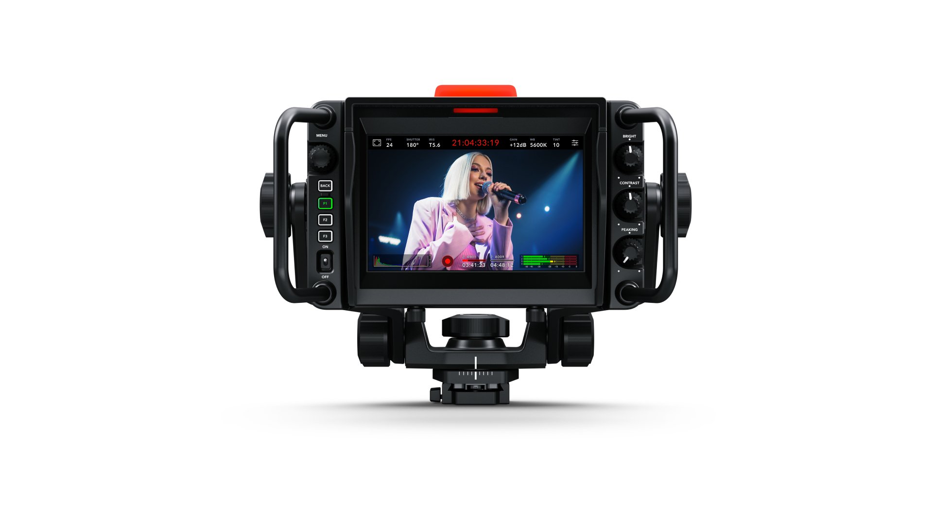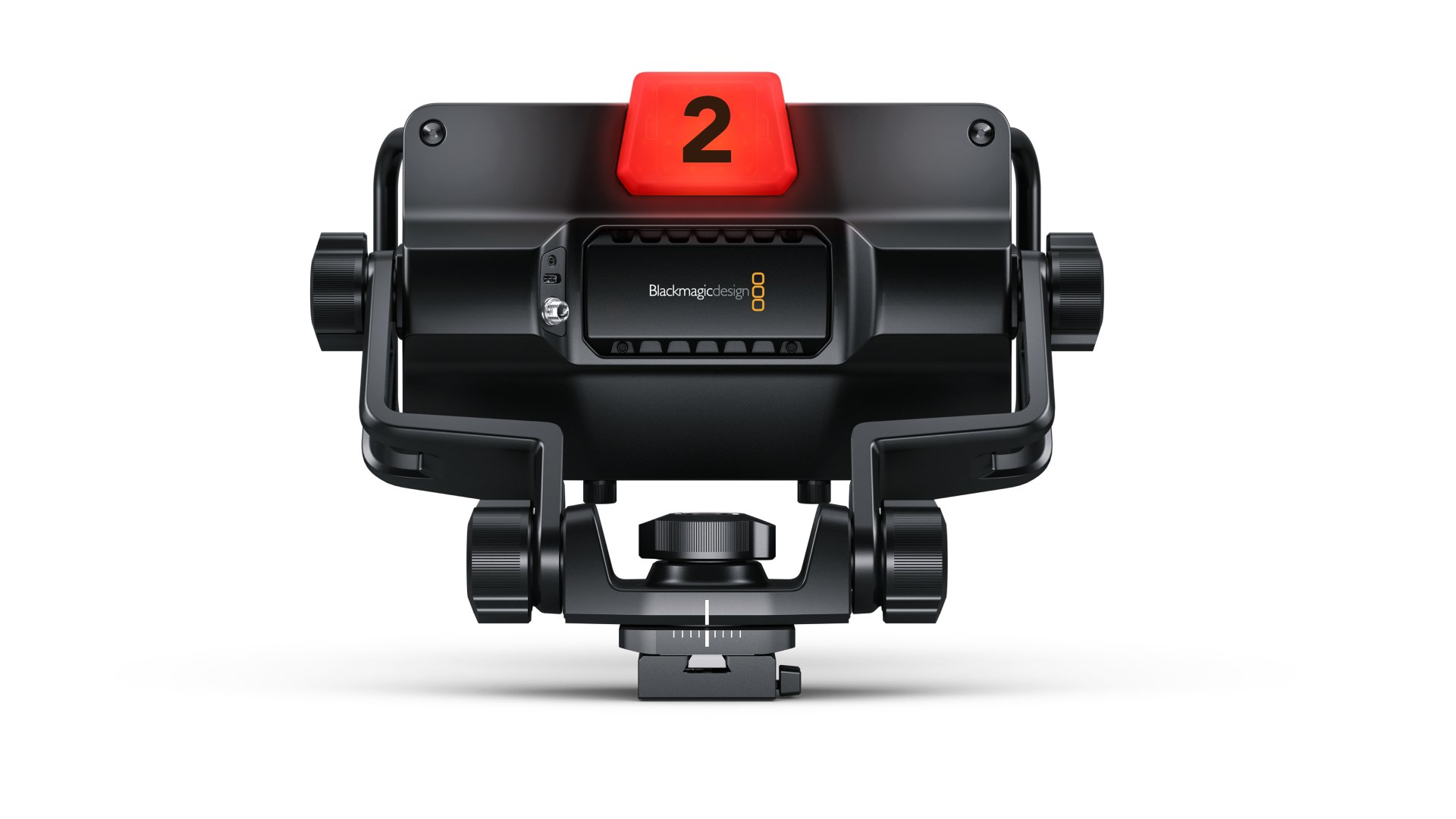 Blackmagic URSA Cine Studio Viewfinder is a large 7″ HDR touchscreen viewfinder with full camera control, designed for use with URSA Cine in live production environments. It combines a high brightness HDR touchscreen with custom function buttons and physical knobs for brightness, contrast and focus peaking. On screen overlays include focus peaking, frame guides, histograms and more, with full touchscreen access to all camera settings. Includes removable sunshade and connects via a single USB-C cable for video, power and camera control.
